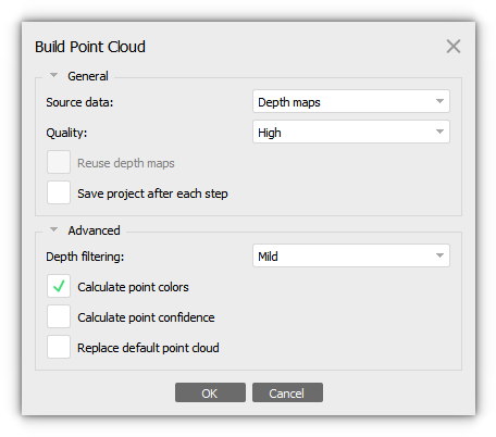 Higher quality used will result in a more accurate surface (bigger number of points), but will take a longer time to process. In most cases Medium quality is sufficient for aerial data processing, especially in cases of low variations of the terrain. Calculate point colors option may be disabled if the point cloud is not among the required task products. This is a way to reduce the processing time a little bit as well as to diminish the disk space required to store the project data.