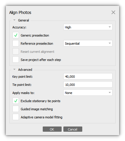If you have a large number of images (more than 100), we recommend enabling - Generic preselection option, to reduce processing time.