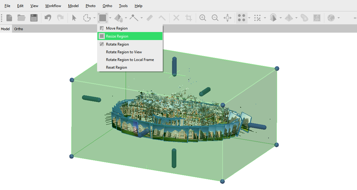 This step is optional since Metashape calculates bounding box dimensions, orientation and location automatically. But it is recommended to check if any correction is needed because further reconstruction step deals only with the data inside the volume. Bounding box can be resized, moved and rotated with the help Resize Region, Move Region, and Rotate Region tool: