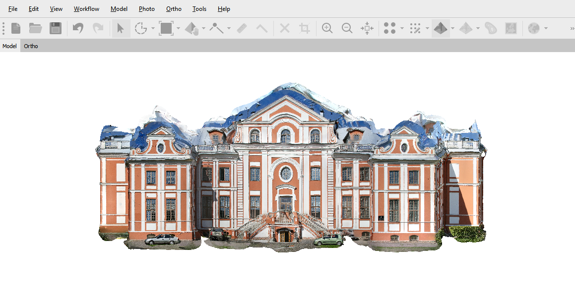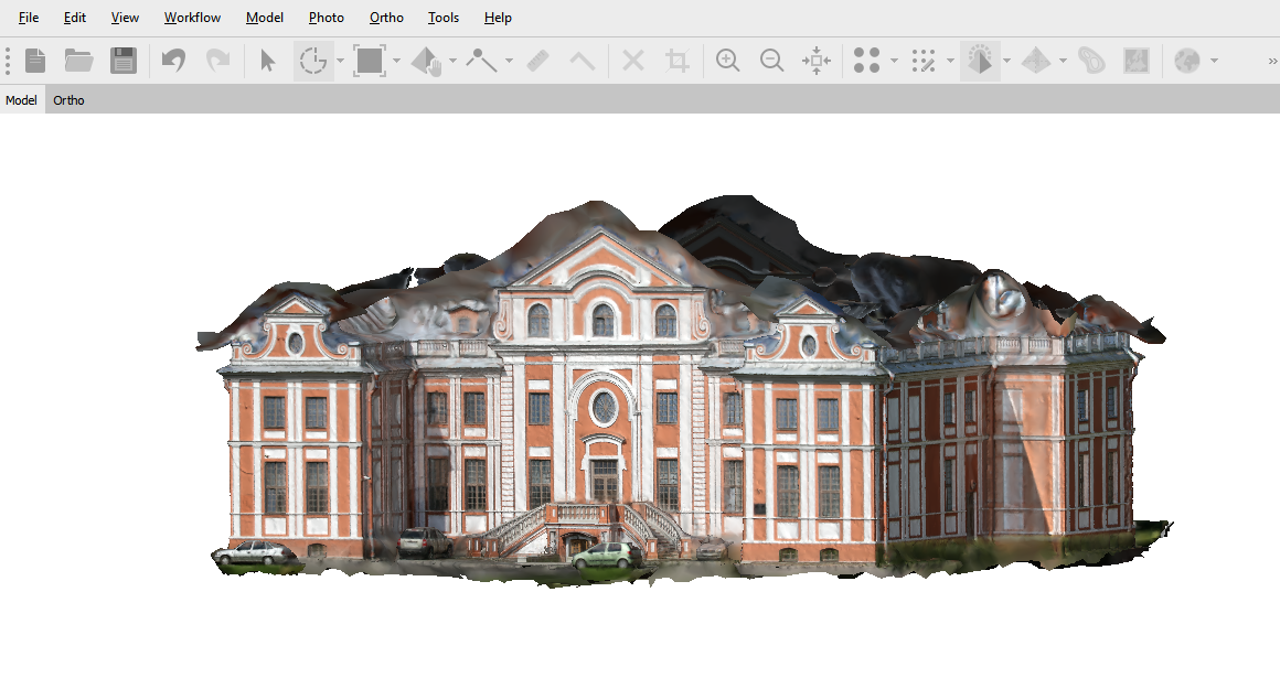 Please note that our example does not include roof images, only terrestrial images, so there is no surface on the roof and there are small artifacts. These areas can be either masked before building the model - Working with masks or manually edited using selection tools - Advanced Selection tools for Point Cloud and Model.
