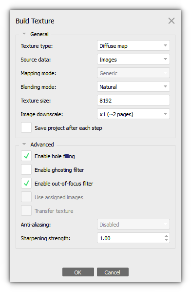 Select Build Texture command from the Workflow menu (Workflow > Build Texture...). Set the following recommended values for the parameters in the Build Texture dialog:
