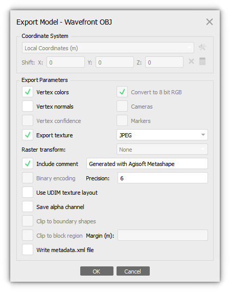 In the Export Model dialog indicate the desired export parameters. Note that the list of available exporting parameters depends on the selected file format. In the example *.obj format was selected.