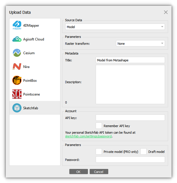Metashape supports direct uploading of the generated data (Point cloud, Textured Model) to various online resources: 4DMapper, PointBox, Pointscene, Sketchfab.