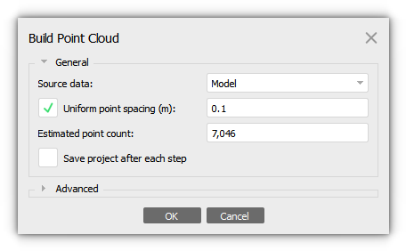 Also, you can build a point cloud from mesh model using Model as Source data in the Build Point Cloud dialog window:Uniform point spacing (m) - specifies the desired distance between points of the point cloud to be generated.
