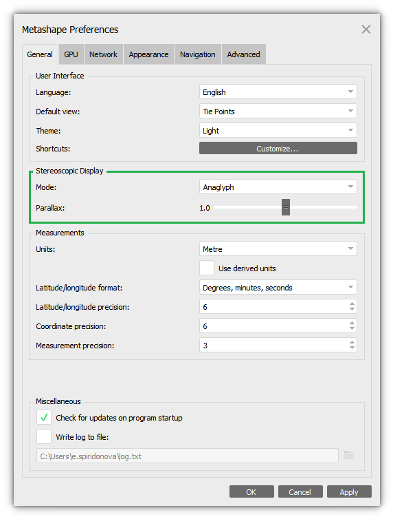 To use the stereo mode display in the Model view, the parameters of Stereoscopic Display Mode for the current hardware need to be adjusted in the General tab of Metashape Preferences dialog available from the Tools menu (Tools > Preferences...). Metashape supports Anaglyph, Hardware, Vertical Split and Horizontal Split stereo modes.