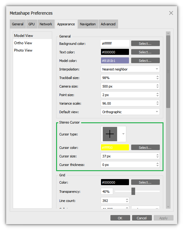By default, the yellow-colored cross will be displayed, but the customization of the cursor color and shape is available from the Model section of the Appearance Preferences tab (select Tools > Preferences > open Appearance tab).