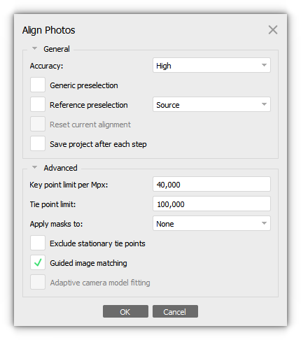1. Select Align Photos... command from the Workflow menu. In the Align Photos dialog set suitable processing options. Guided image matching option can be used to increase the number of detected tie points.