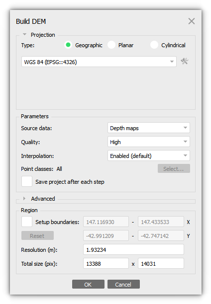 1. Select Build DEM command from the Workflow menu. Set the following recommended values for the parameters in the Build DEM dialog: