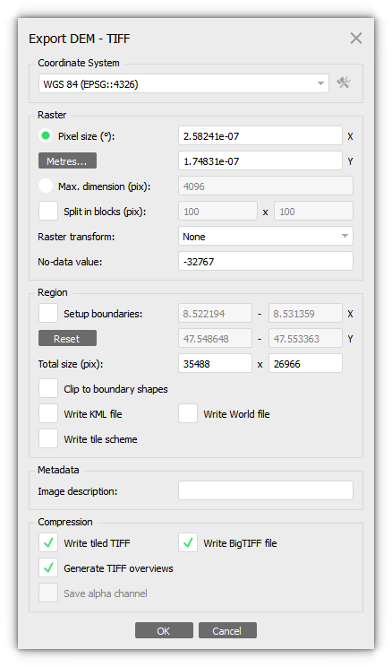 2. In the Export DEM dialog, specify the desired coordinate system for DEM export. Check Write KML file and/or Write World file options to create files needed to georeference the orthomosaic in the Google Earth and/or a GIS-application, if necessary.