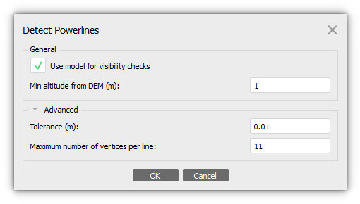 If powerlines are present in the scene, select the Detect Powerlines... command from the Tools menu (Tools > Detect Powerlines...) and run it with default parameters.