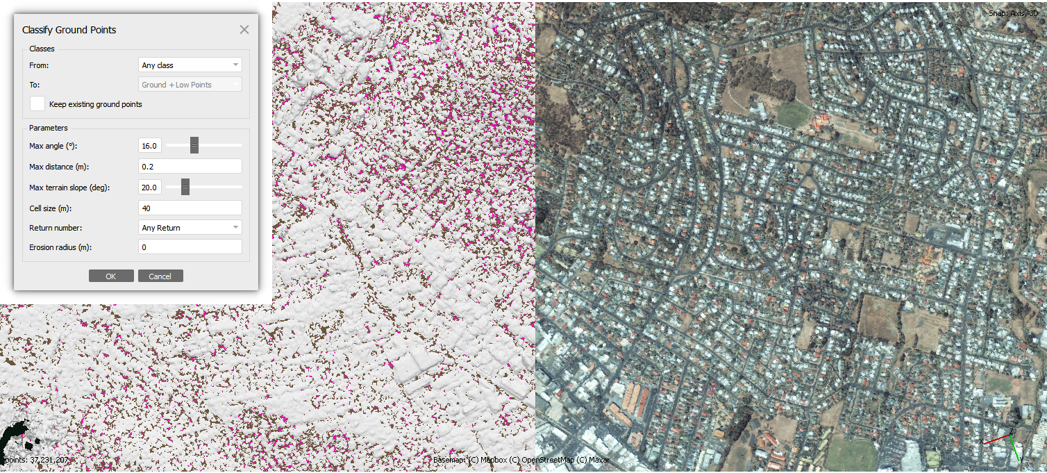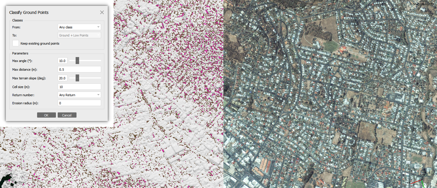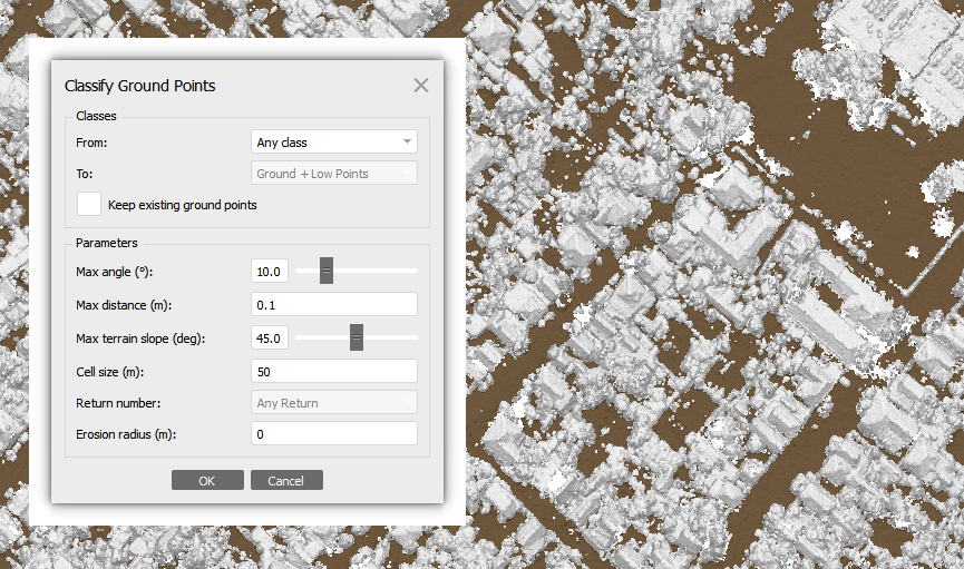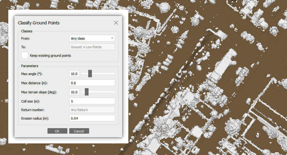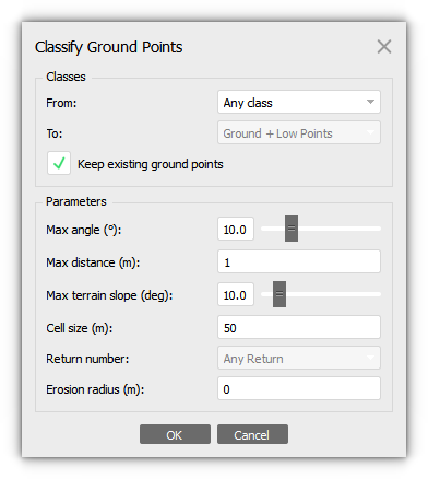 Select Tools > Point Cloud > Classify Ground Points... to open Classify Ground Points dialog window: