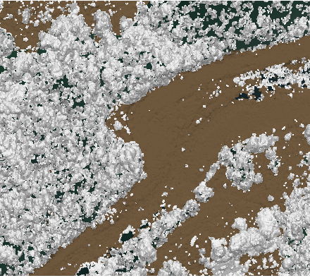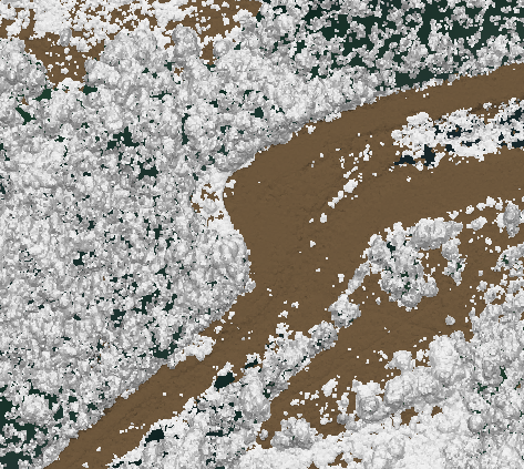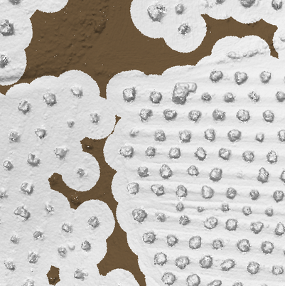 The example point clouds for aerial photography of a rural area with houses and of a city district are presented below. On the classified point cloud of a rural area with houses, the ground points are colored in brown, while the points above the ground are grey: