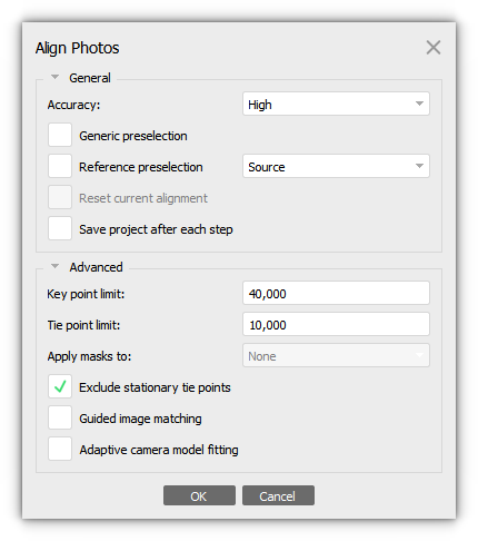 2. Set the parameters in the Align Photos dialog window:
