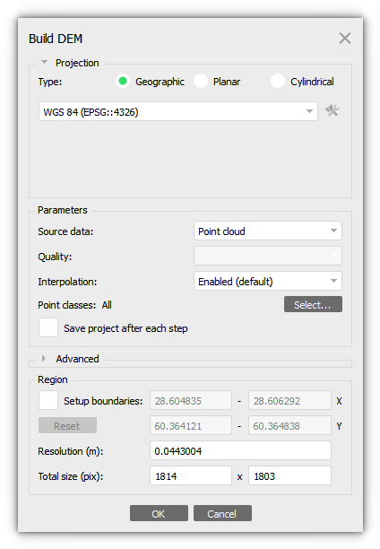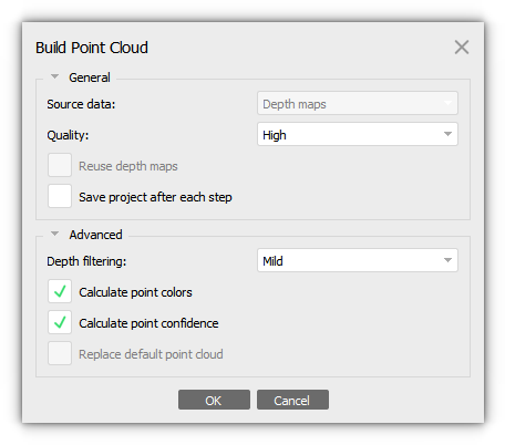 2. In the Build Point Cloud dialog box select the desired reconstruction parameters and click the OK button.
