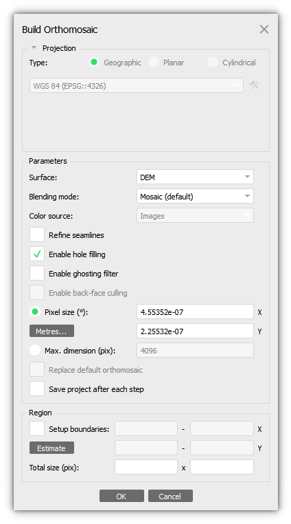 2. Set parameters in the Orthomosaic dialog window.