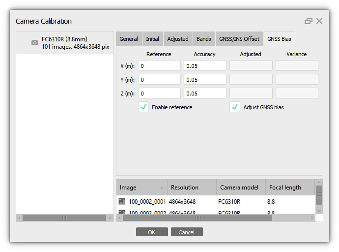 When using GNSS during shooting, there may be a systematic shift between the coordinate system of the images and the coordinate system of the reference data (ground control points). The linear values of this shift can be calculated in Metashape. It is important that the project has GCPs and their positions are clarified on the photos. And it is also important to enable checkboxes for image coordinates on the Reference pane. To minimize and calculate this error, enable the Adjust GNSS bias option on the GNSS Bias tab in the Camera Calibration dialog box (select Tools > Camera Calibration). Then, after alignment, the updated bias data will be available. If these offsets are known, it is also important to specify them. In this case enable checkbox for the Enable Reference option and specify the parameters:![]()