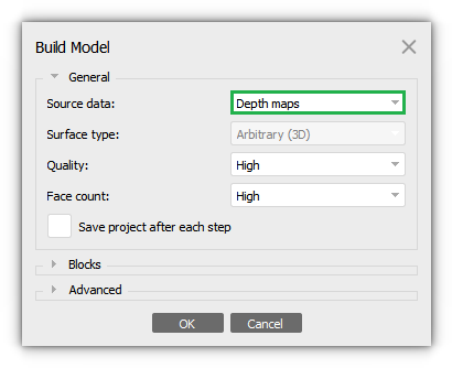 For this case, when you are using images with depth maps, you need to select Source data - Depth maps in the Build Model dialog window (select Workflow > Build Model). The algorithm will use the automatically imported depth maps: