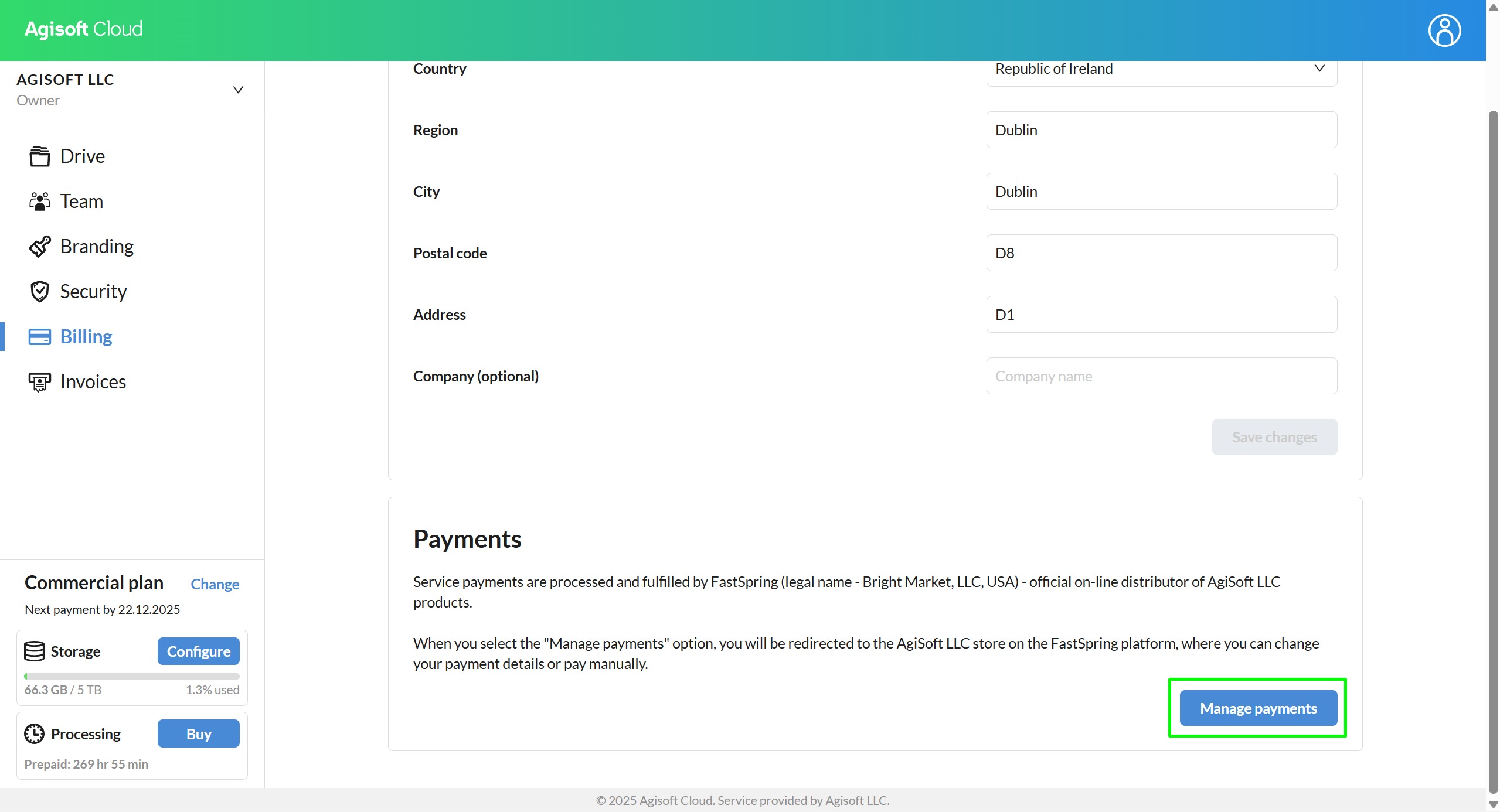 - Scroll the page down to the Payment section and click on the Manage payments button