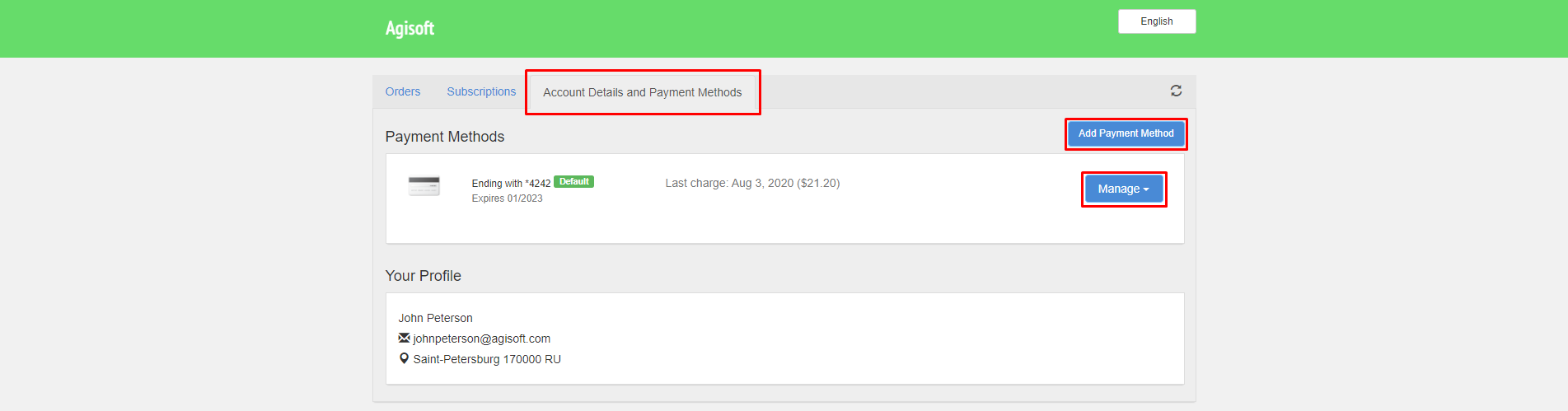 - On your personal page on the FastSpring platform click on the Account Details and Payment Methods tab