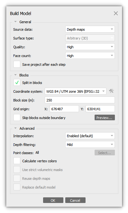 To build block model select the Build Model... command from the Workflow menu (Workflow > Build Model...). In the Build Model dialog box select the desired reconstruction parameters: