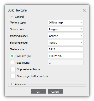 You can set the Pixel size (m) in the Build Texture dialog box to get a photorealistic texture. The parameter is calculated automatically, but it is possible to specify a different value for pixel size.
