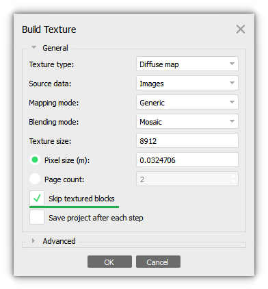 After you have imported the edited part of the block model, you can re-build the texture for this area, while preserving the texture for other tiles and not rebuilding the entire texture. For the purpose enable the Skip textured blocks option in the Build Texture dialog window: