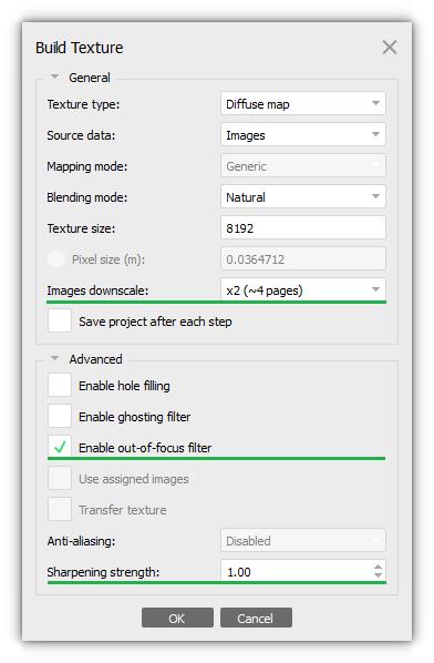 - Enable out-of-focus filter - algorithm excludes areas that were out of focus during the shooting, suitable for close-range projects. Not recommended for aerial data.