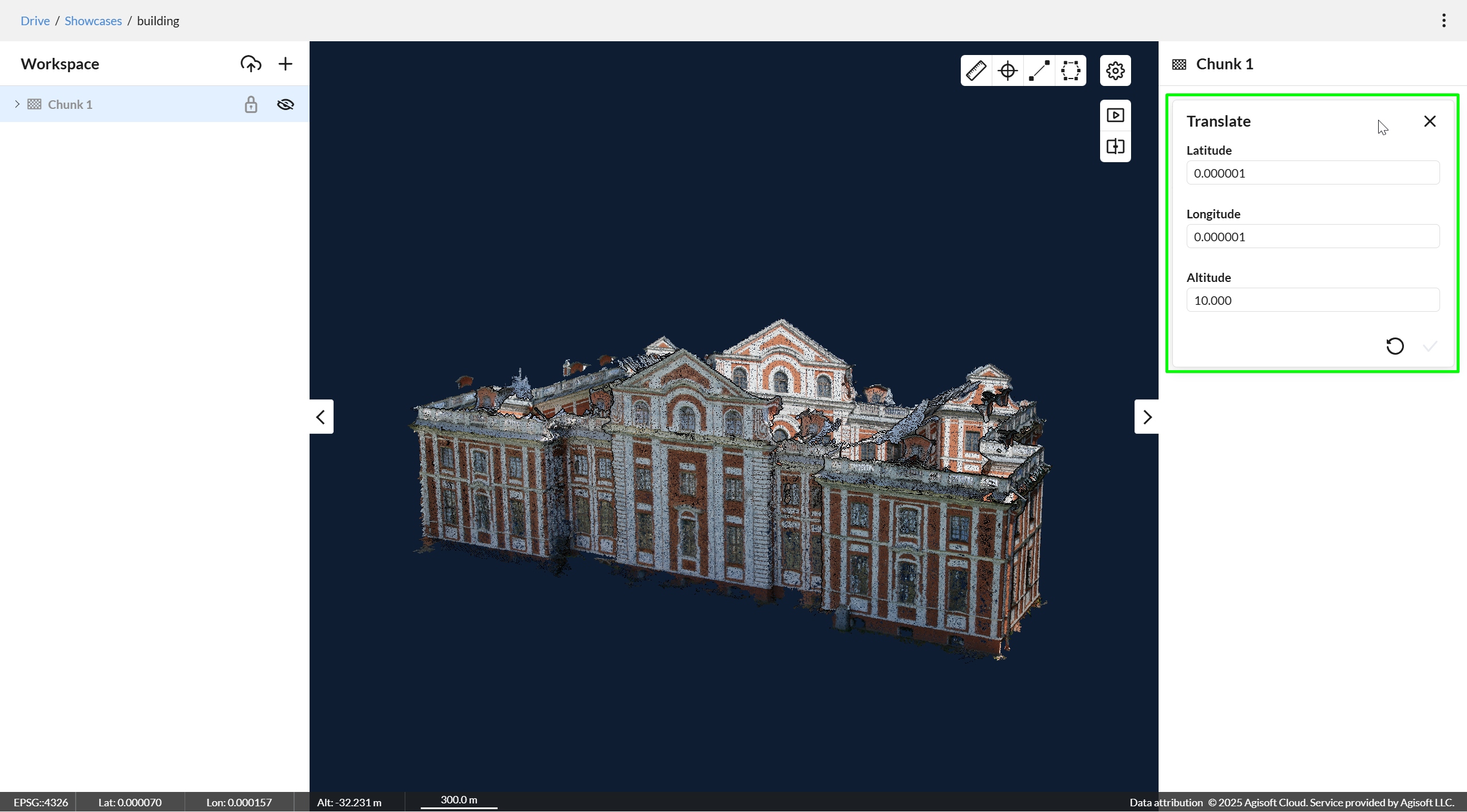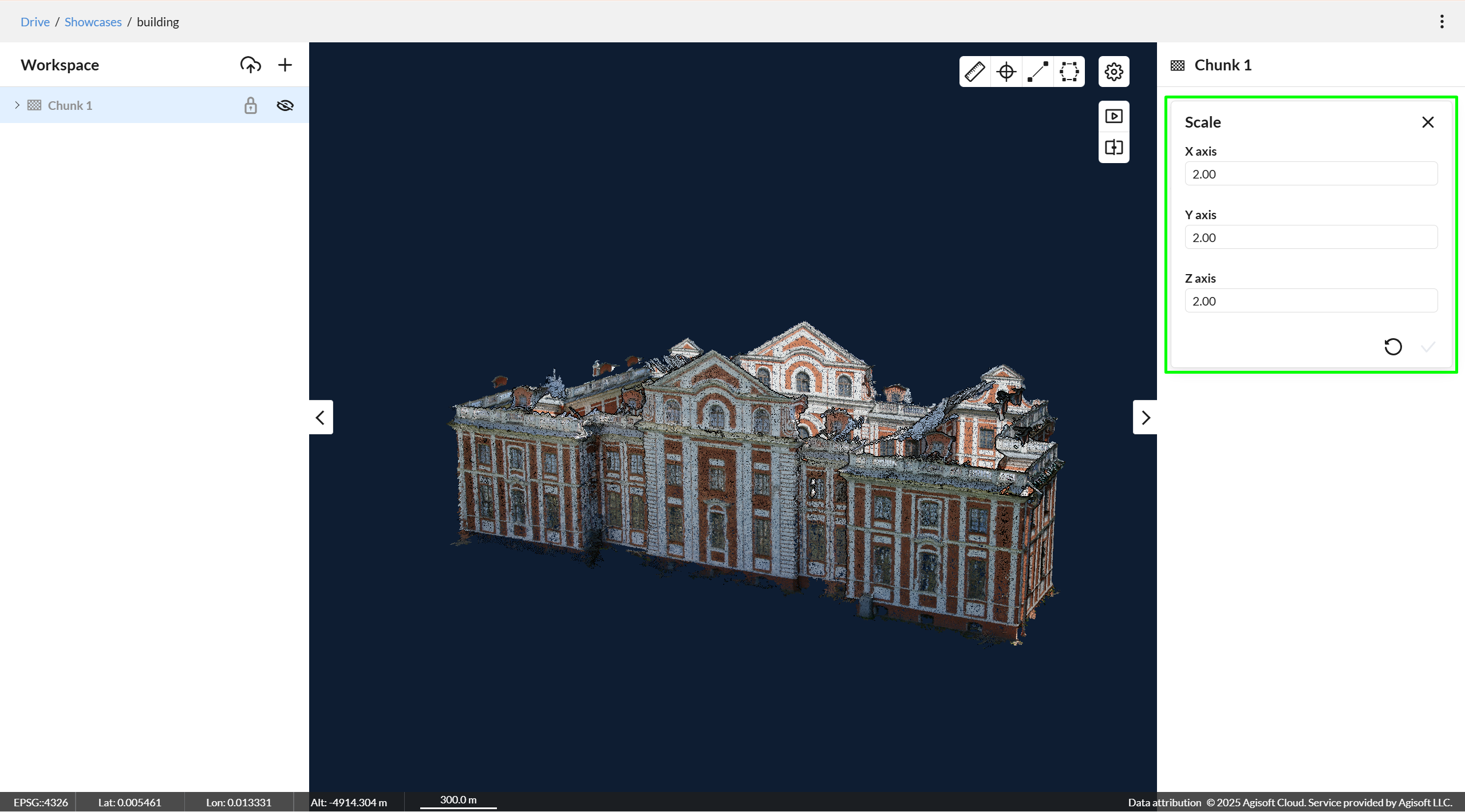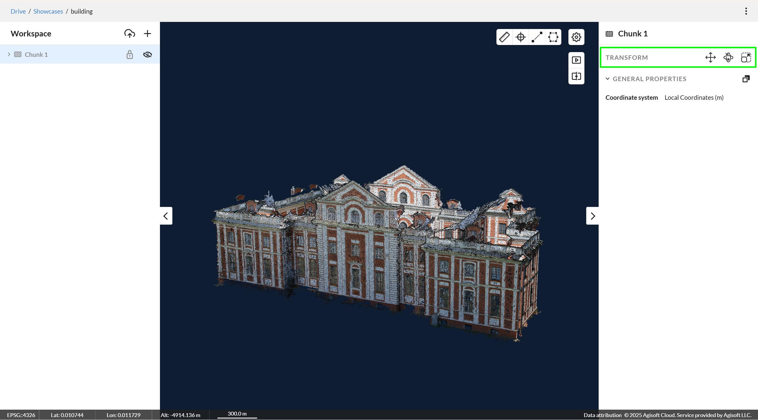 Tiled Models, 3D Models, Point Clouds, and Chunks defined in a local coordinate system support transformation settings, allowing you to adjust position, rotation, and scale.